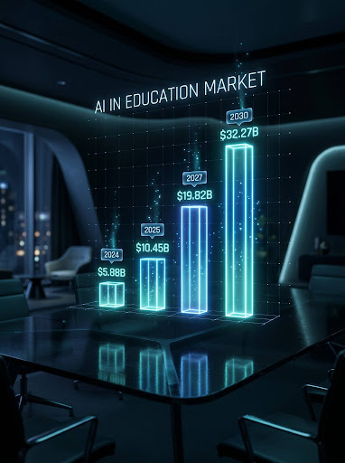 The statistics speak for themselves. Grand View Research estimates the global AI in education market size to be $5.88 billion in 2024 and projects it to increase as high as $32.27 billion by 2030 with a CAGR of 31.2%. That is 36% of the market held by no less than North America alone.